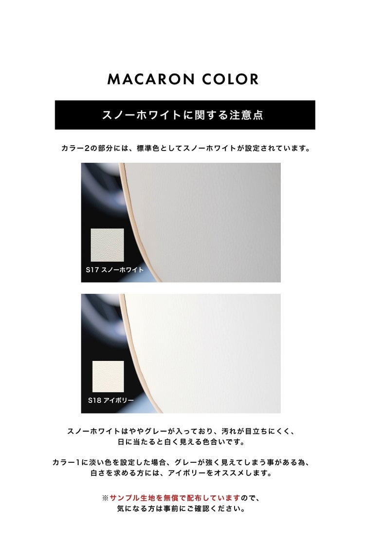 カラー2のホワイトについては、スノーホワイトとアイボリーの2色から 選べるようになっています。スノーホワイトはややグレーがかっており、汚れが目立たない色合いです。 白さを求める場合はアイボリーがオススメです。※サンプル生地を無償で配布していますので、 気になる方は事前にご確認ください。