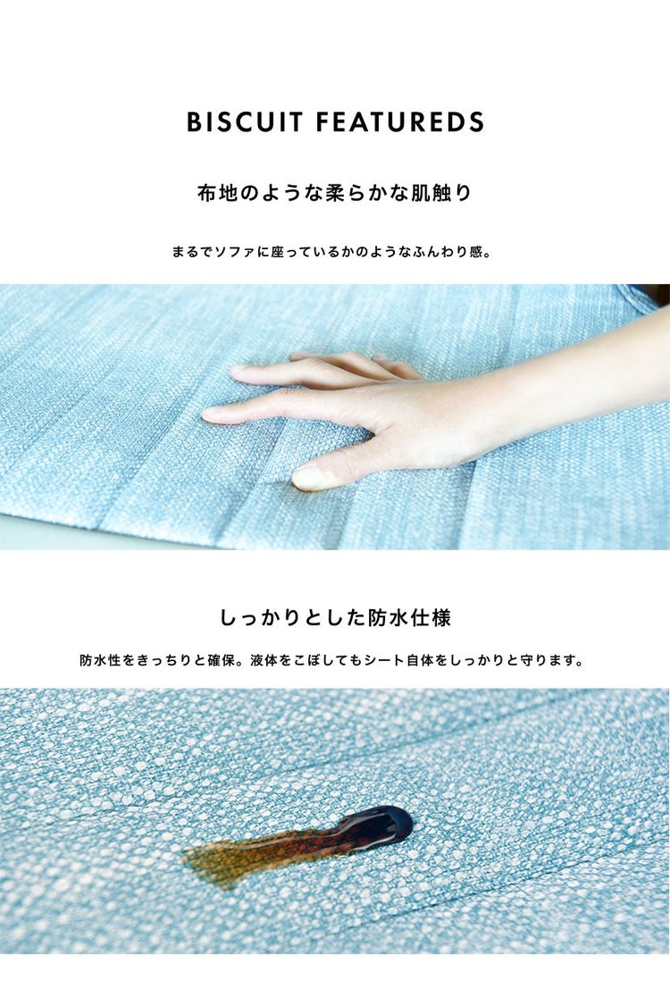 布地のような質感でありながら、 布地の欠点である防水性をきっちりと確保。 水分を通さないため、 液体をこぼしても、 シート本体をしっかりと守ります。