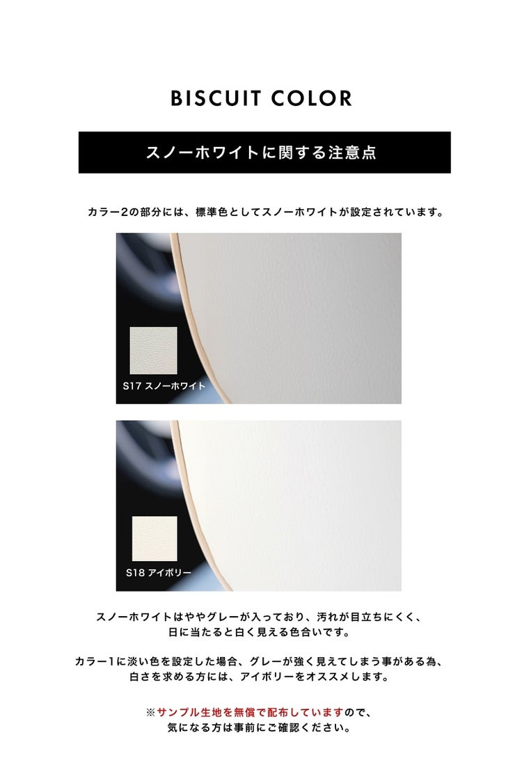 カラー2のホワイトについては、スノーホワイトとアイボリーの2色から 選べるようになっています。スノーホワイトはややグレーがかっており、汚れが目立たない色合いです。 白さを求める場合はアイボリーがオススメです。※サンプル生地を無償で配布していますので、 気になる方は事前にご確認ください。