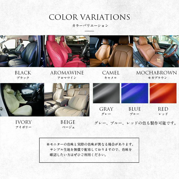 本製品は車種別に専用設計されたシートカバーです。お車の年式・型式・グレードによってシートの形状が異なりますので、シートカバーを車種の型専用に製作しております。適合表からお客様のお車と一致する品番をご確認いただき、ご注文時にご指定下さい。(車検証と照らし合わせていただくとスムーズに確認がとれます)