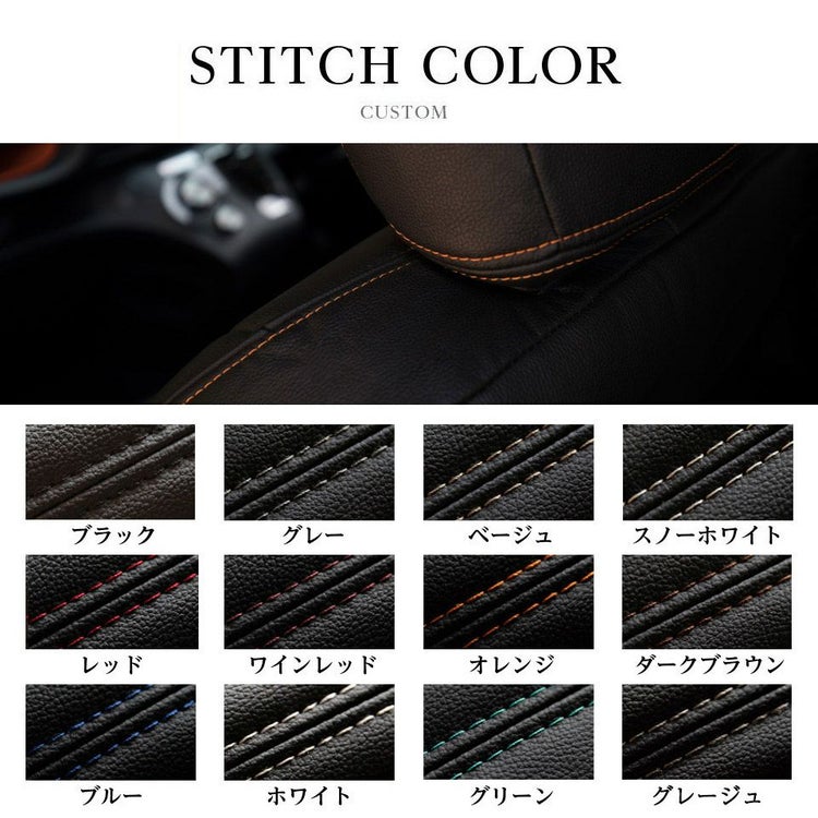 シートカバーの最も接触頻度の高い背もたれと座面部分に、質感の良いレザーを使用。そしてレザーの通気性をさらに高めるため、パンチング加工を施した箇所に、ダブルダイヤステッチ加工を加えました。ステッチカラーは12色から選ぶことが可能。オリジナリティの高いシートカバーを製作いただけます。