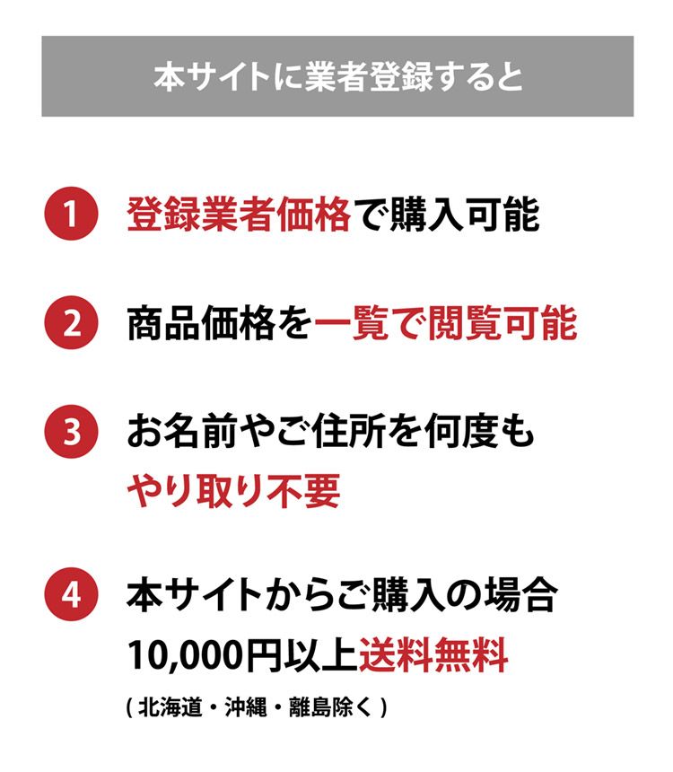一度業者登録をいただければ商品価格を一覧でご覧いただいたり、お名前やご住所を何度もやり取りする必要がなくなりますのでスムーズです。また、ショッピングサイトからご購入いただく場合は、10000円以上送料無料(北海道・沖縄・離島を除く)となります。