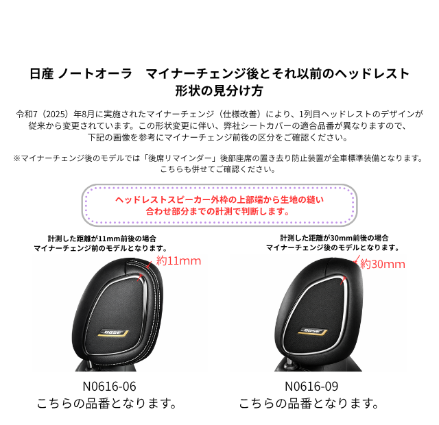 | 適合形状 | BOSE(オプション)パーソナルプラスサウンドシステム装着車 (1列目ヘッドレスト側面にスピーカーが付く) 2025年8月28日(令和7年)以降、一部仕様の改良により、それ以前の車両と比べてデザインが変更されヘッドレストの形状が異なります。 後席リマインダー(後席置き去り防止機能)が標準装備されています。 各グレードの寒冷地仕様(ホットプラスパッケージ)装着車(前席シートヒーター付き)適合可 1列目アームレストカバー無し ※令和7年(2025年)8月に行われたマイナーチェンジで前後のモデル(ヘッドレスト)の形状が異なります。 見た目だけでは判別が難しいため、下記補足画像にて判別方法を説明しておりますので、ご参照ください。 |