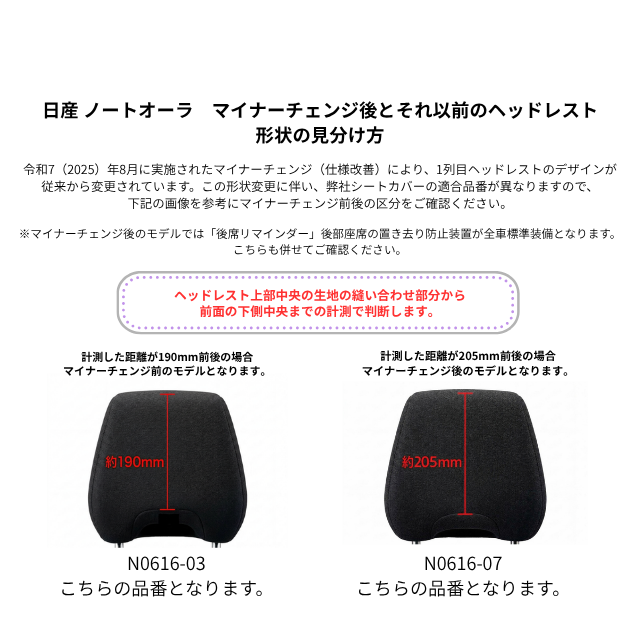 | 適合形状 | BOSE (オプション) パーソナルプラスサウンドシステム非装着車 (1列目ヘッドレスト側面にスピーカーが付かない) 2025年8月28日(令和7年)以降、一部仕様の改良により、それ以前の車両と比べてデザインが変更されヘッドレストの形状が異なります。 後席リマインダー(後席置き去り防止機能)が標準装備されています。 各グレードの寒冷地仕様(ホットプラスパッケージ)装着車(前席シートヒーター付き)適合可 1列目アームレストカバー無し ※令和7年(2025年)8月に行われたマイナーチェンジで前後のモデル(ヘッドレスト)の形状が異なります。 見た目だけでは判別が難しいため、下記補足画像にて判別方法を説明しておりますので、ご参照ください。 |